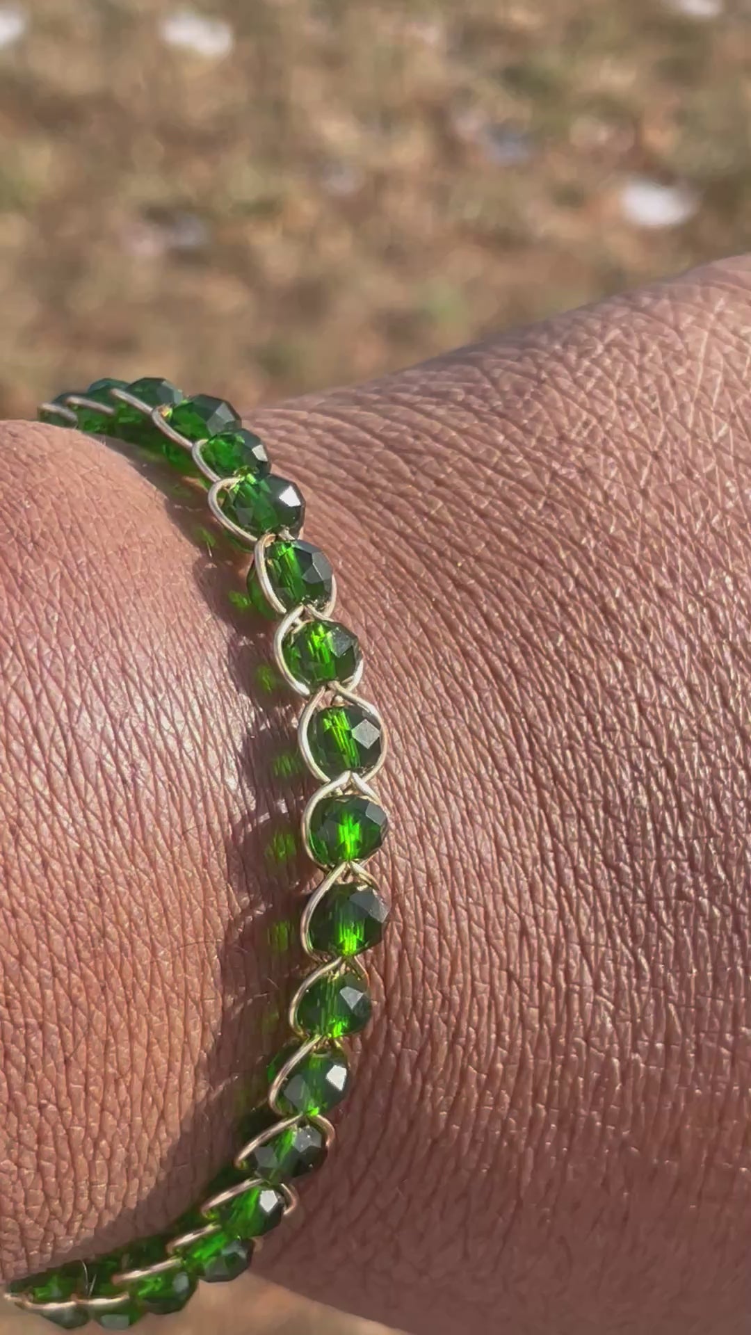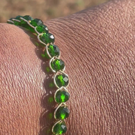 The final link is accented with a single 4mm glass bead for a delicate finish, while the body of the bracelet shimmers with emerald-toned faceted glass rondelle beads that dance in natural light.