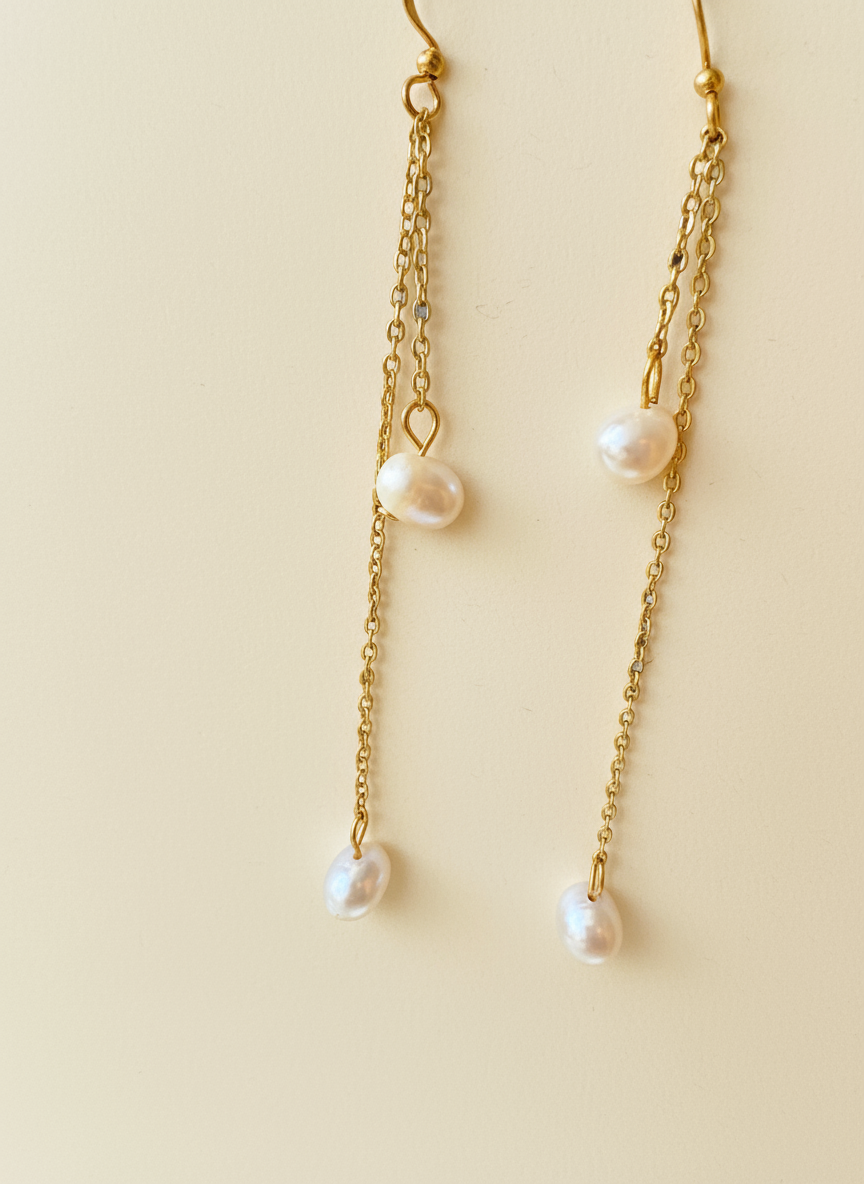 The Layla Freshwater Pearl Earrings are a modern take on timeless elegance — handcrafted with luminous freshwater rice pearls suspended from delicate 18K gold-plated stainless steel chains and ear wires. Each piece moves softly with you, catching the light in all the right ways.