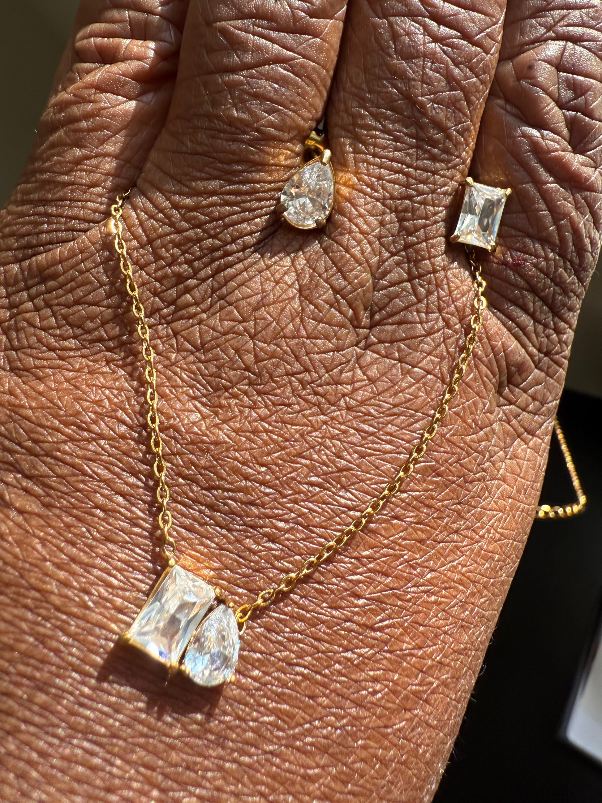 Celebrate individuality with our Mix Match Stud Set, a fresh take on classic sparkle. Featuring one rectangular-cut stud and one teardrop-shaped white zircon stone, this mismatched pair is crafted in polished 18K gold-plated stainless steel for a modern, refined finish.