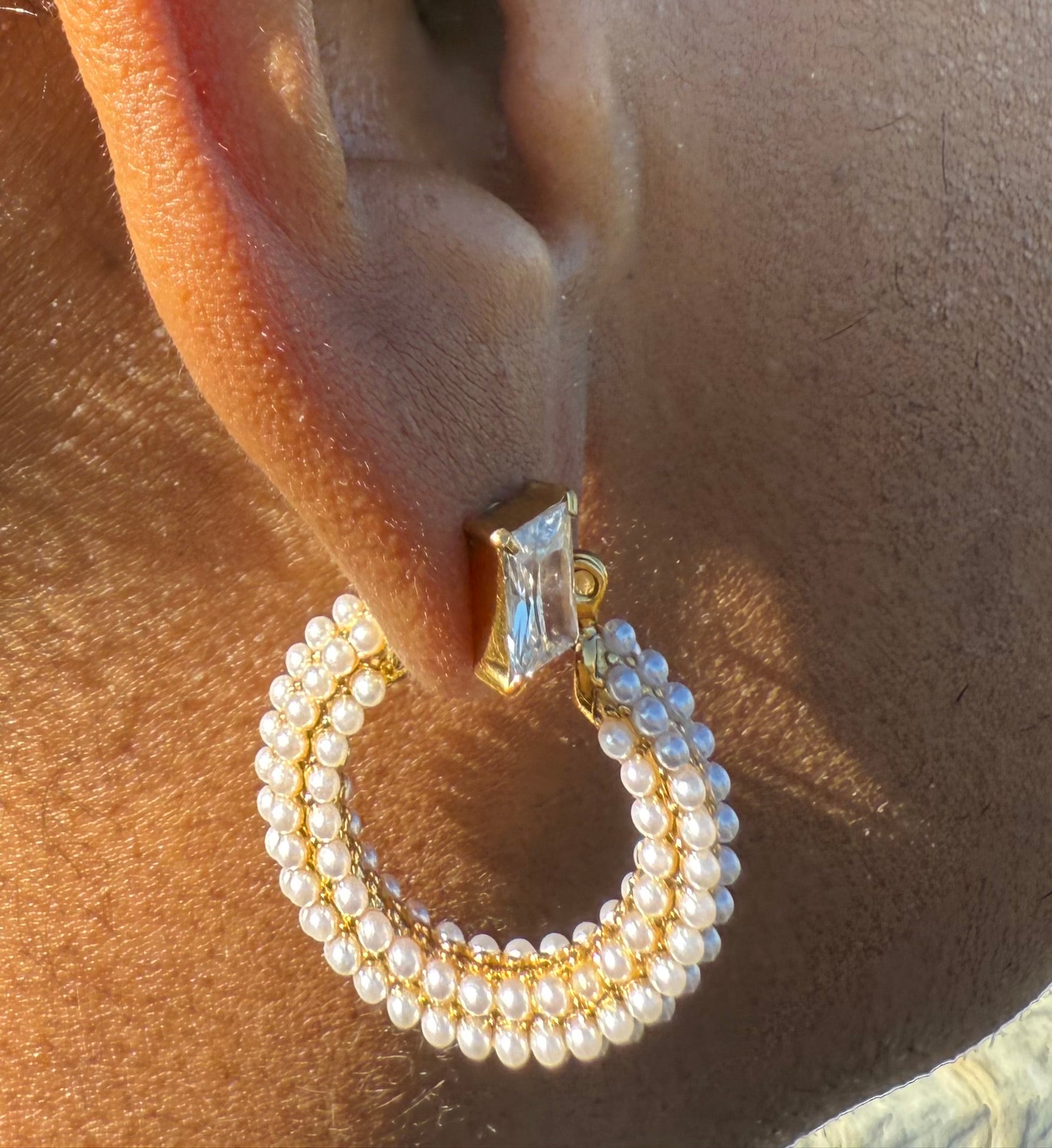 The gold rectangular stud base adds a contemporary contrast to the soft pearlescent hoops, creating a perfect balance of grace and confidence. Whether styled with your favorite dress or a crisp white shirt, these earrings instantly add a touch of quiet luxury.